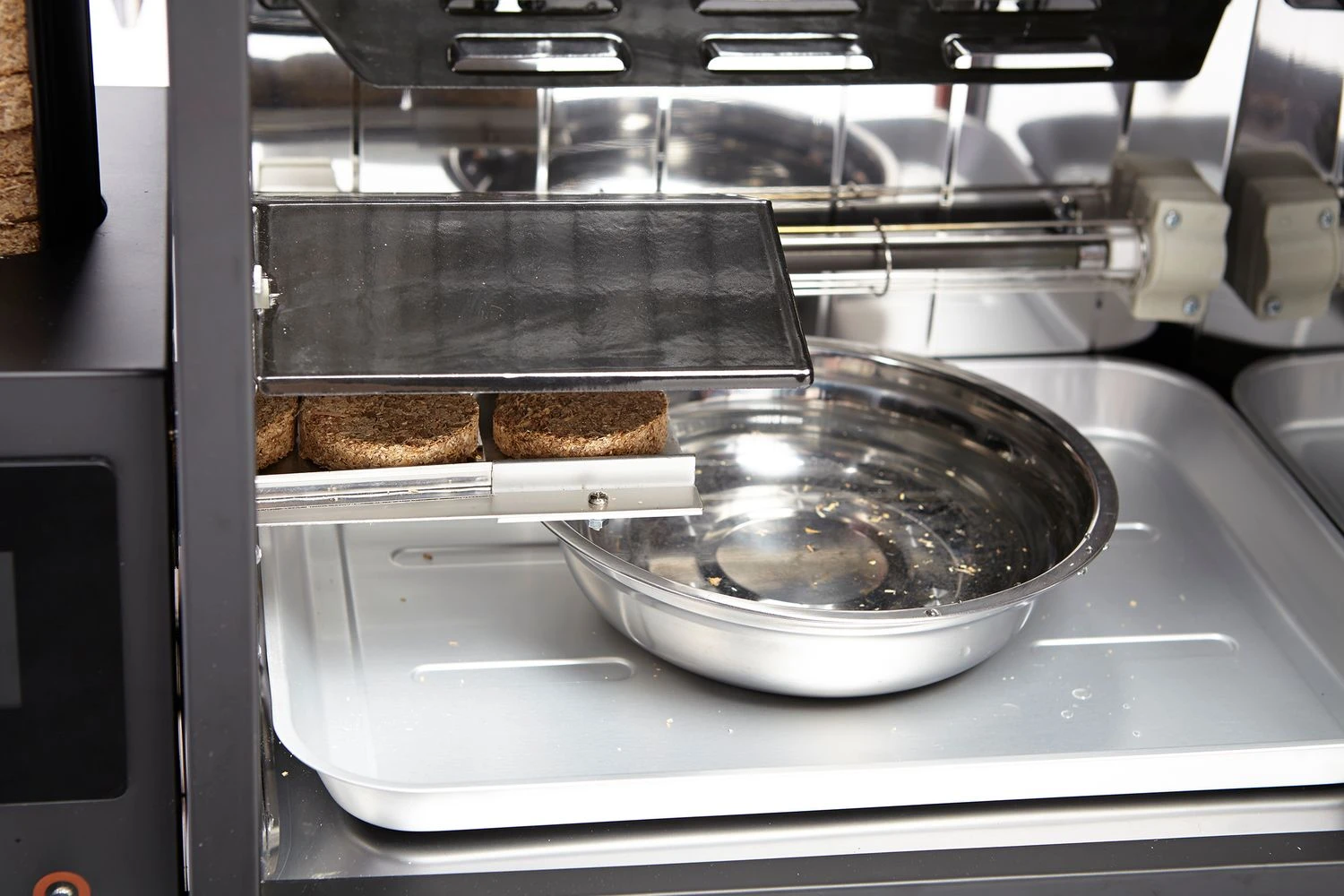 Nach dem Starten arbeitet der Smoker völlig automatisch und hält die von Ihnen zuvor eingestellte Temperatur. Dabei werden die Hartholz – Räucherbisquetten außerhalb des Räucherschranks in einer Aufbewahrung gestapelt. Während des Räuchervorgangs schiebt sich nun alle 20 Minuten eine Bisquette in den Feuerraum über ein Heizelement. Noch bevor die Bisquette unerwünschten weißen Rauch und Asche produziert, wird sie ganz automatisch gelöscht und eine neue Bisquette entzündet.