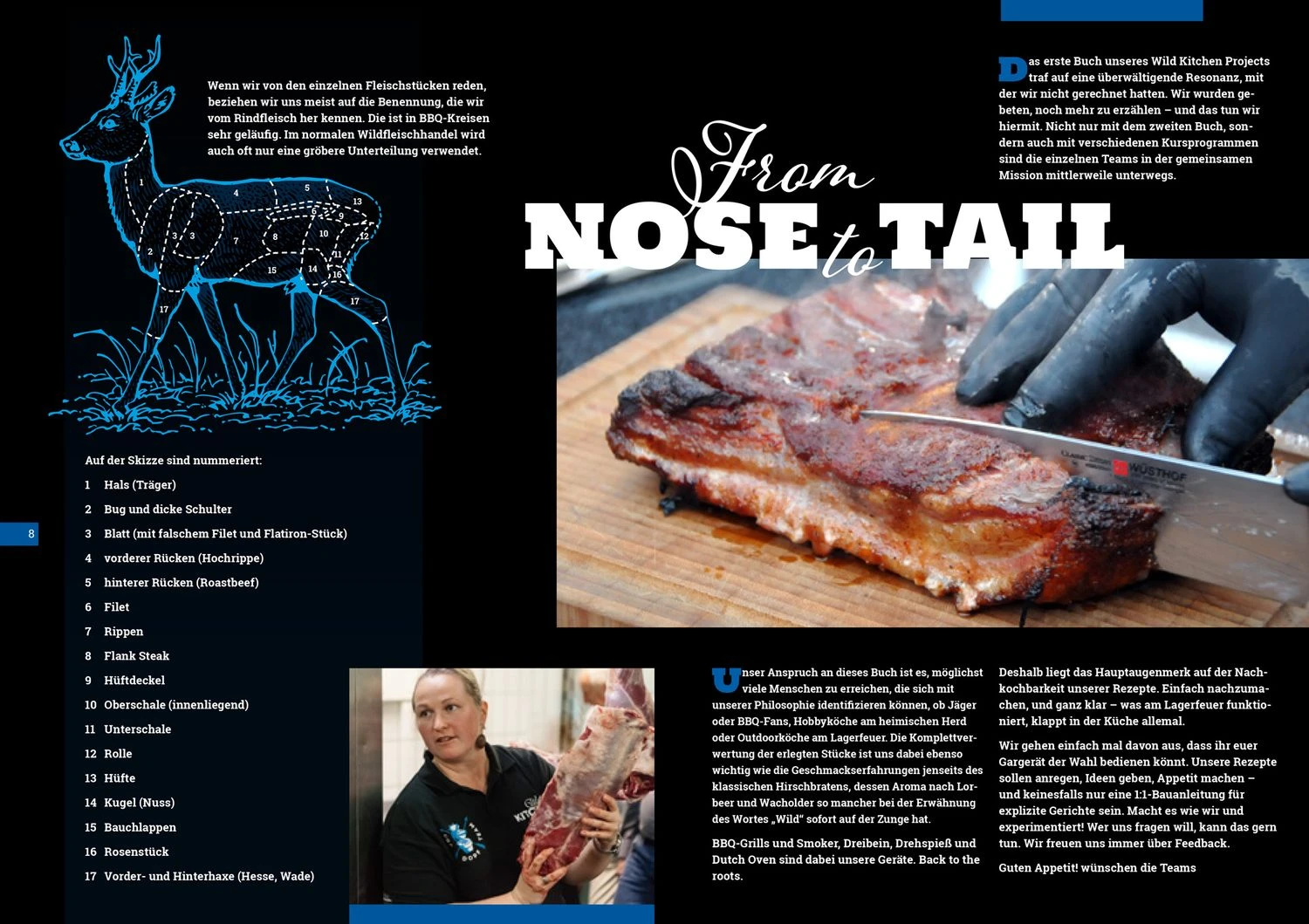 Unter dem Motto „from nose to tail“ werden alte Rezepte neu interpretiert und Grillklassiker auf andere Tierarten übertragen. Wie wäre es also mit einem T-Bone-Steak vom Hirsch, Fleischkäse aus Wildbret oder der guten alten Ochsenschwanzsuppe aus dem Dutch Oven?