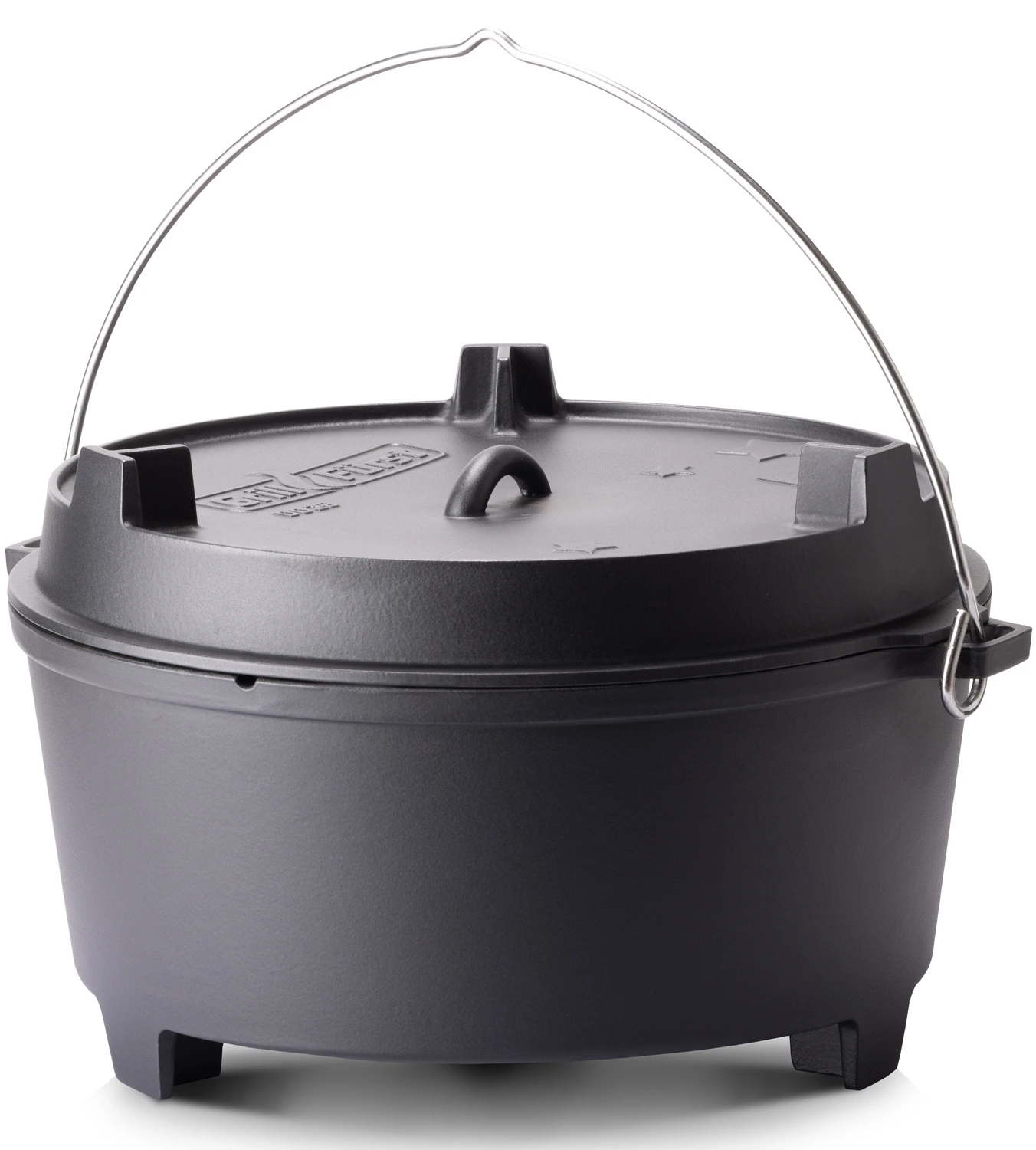 Durch die spezielle Auslegung der Standfüße finden Topf wie auch Deckel (wenn er als Grillpfanne genutzt wird) automatisch und sicher auf jedem Rost zu einem stabilen Stand. Dutch Oven Modelle “ohne Füße” sind damit nicht mehr notwendig.