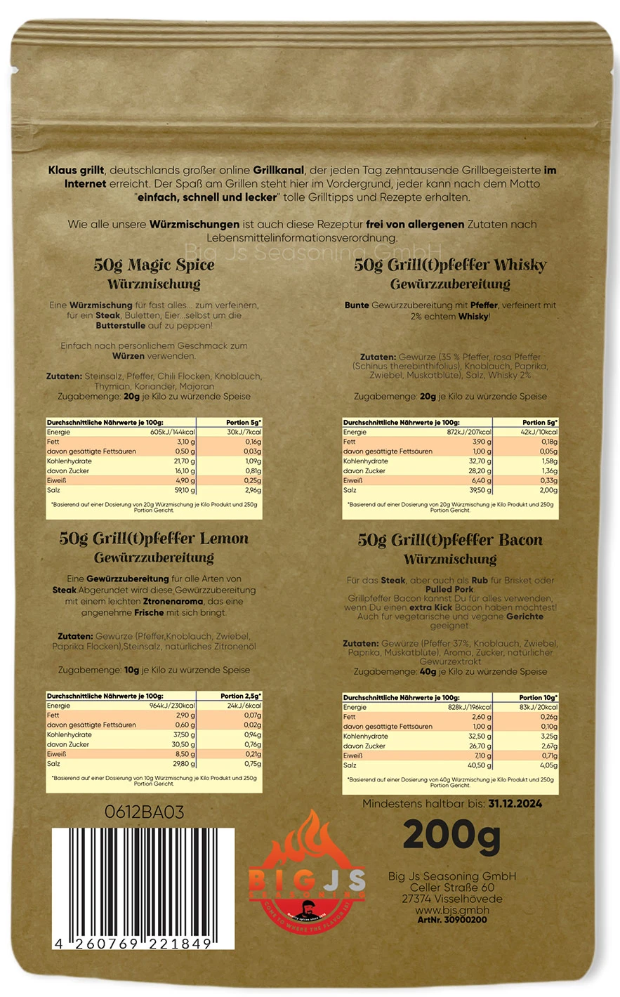 | Inhaltsstoffe / Zutaten | Magic Spice: Steinsalz, Pfeffer, Chiliflocken, Knoblauch, Thymian, Koriander, Majoran Grill(t)pfeffer Whisky: Gewürze (35% Pfeffer, rosa Pfeffer (Schinus therebinthifolius), Knoblauch, Paprika, Zwiebel, Muskatblüte), Salz, 2% Whisky Grill(t)pfeffer Lemon: Gewürze (Pfeffer, Knoblauch, Zwiebel, Paprikaflocken), Steinsalz, natürliches Zitronenöl Grill(t)pfeffer Bacon: Gewürze (37% Pfeffer, Knoblauch, Paprika, Zwiebel, Muskatblüte), Aroma, Zucker, natürlicher Gewürzextrakt |